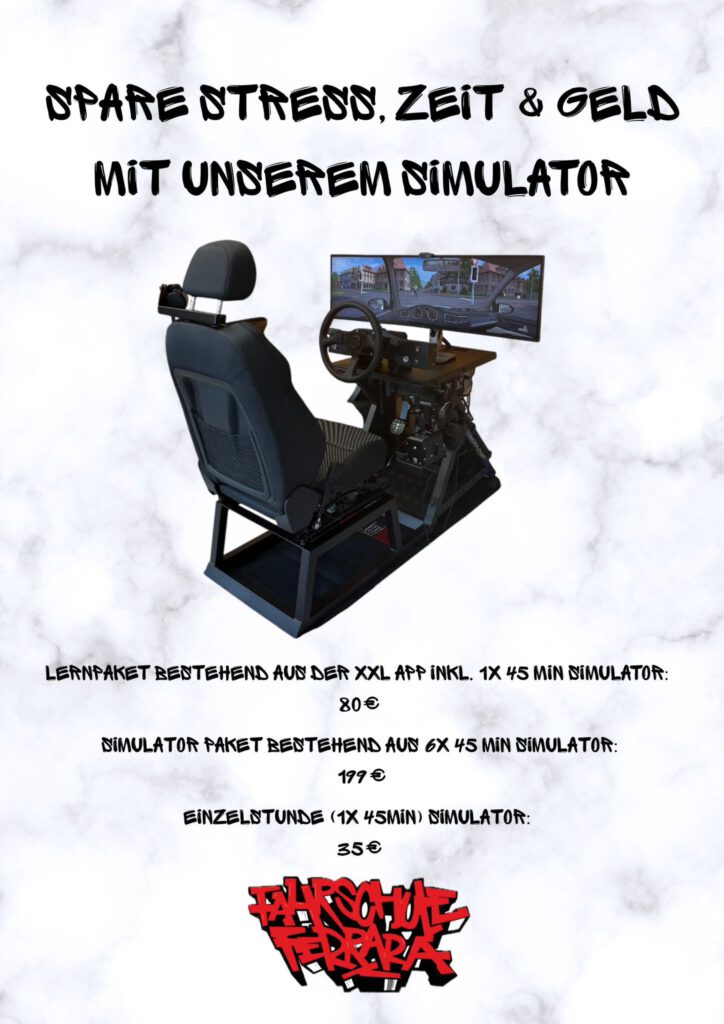 Mit unserem modernen Fahrsimulator sparst du Zeit, Geld und Nerven. Perfekt geeignet, um dich stressfrei auf den Straßenverkehr vorzubereiten – ganz ohne Risiko.